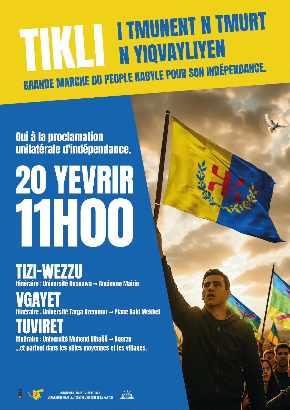 Le Mouvement pour l’Autodétermination de la Kabylie (MAK) appelle l’ensemble du peuple kabyle à se mobiliser massivement à travers tout le pays kabyle. Des marches populaires auront lieu dans les grandes villes telles que Vgayet, Tizi-Wezzu, Tuviret, mais aussi dans toutes les communes et villages de Kabylie.