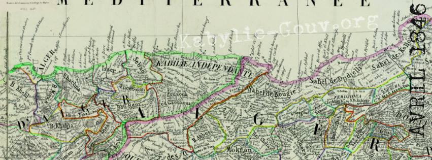(*) Illustration : KABYLIE INDEPENDANTE : Carte établie en avril 1846 par Ernest Carette et Auguste Warnier, membres de la Commission Scientifique de l’Algérie (L’Algérie est une appellation inventée par la France le 14 octobre 1839). Source : Bibliothèque nationale de France, département Cartes et plans