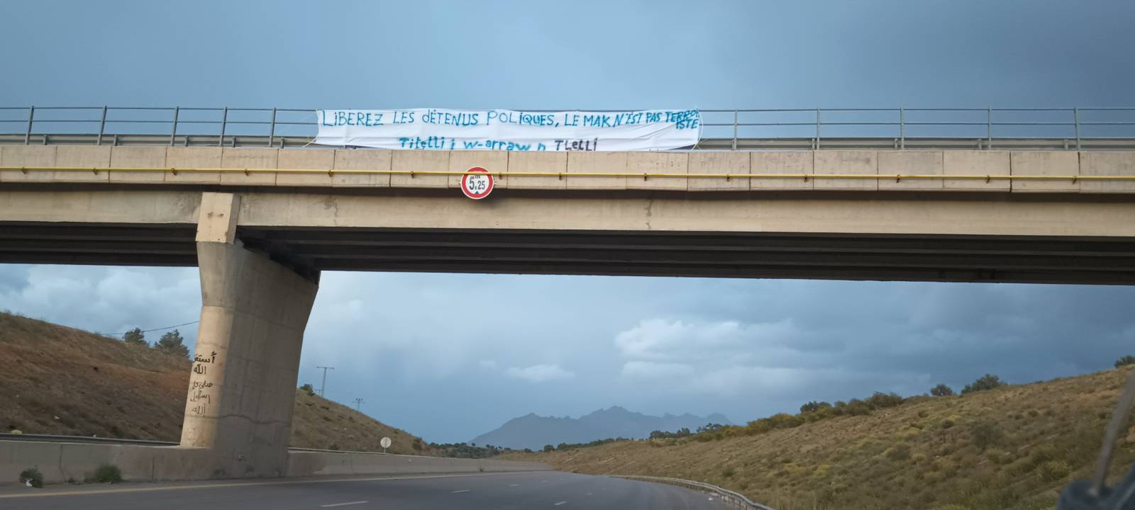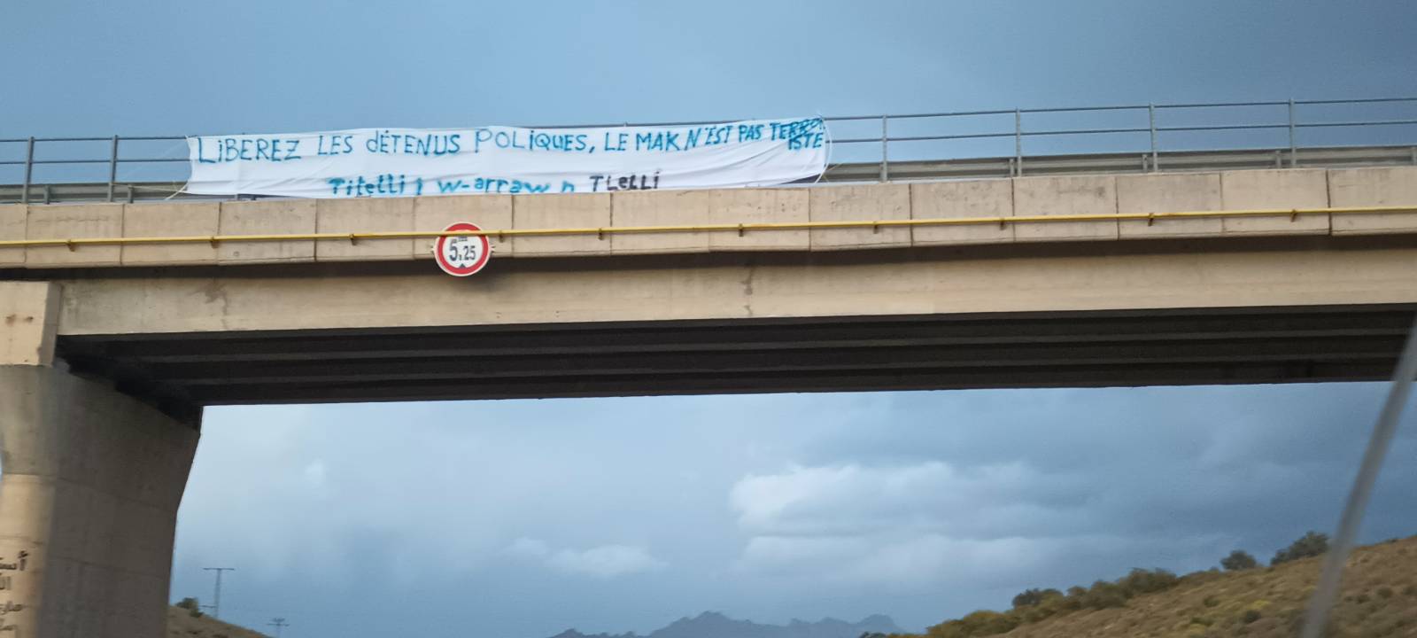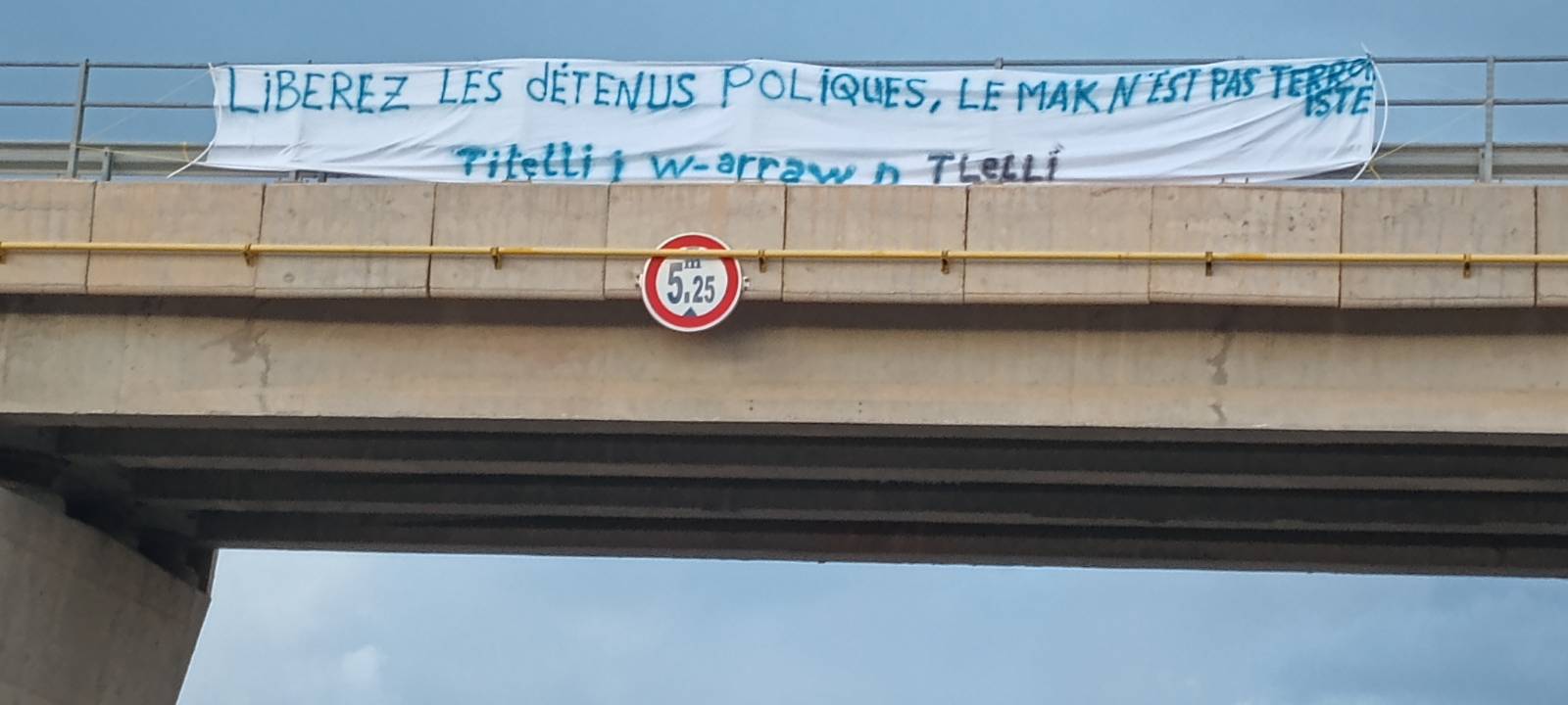 Vgayet, Kabylie (Siwel), 30 Mars 2025 – Il y a quelques jours, des militants kabyles ont mené une action symbolique en Kabylie, suspendant des banderoles sur deux ponts de l’autoroute Vgayet-Tuviret : l’une sur la bretelle menant vers Aqvu, l’autre sur celle menant vers Allaɣen.