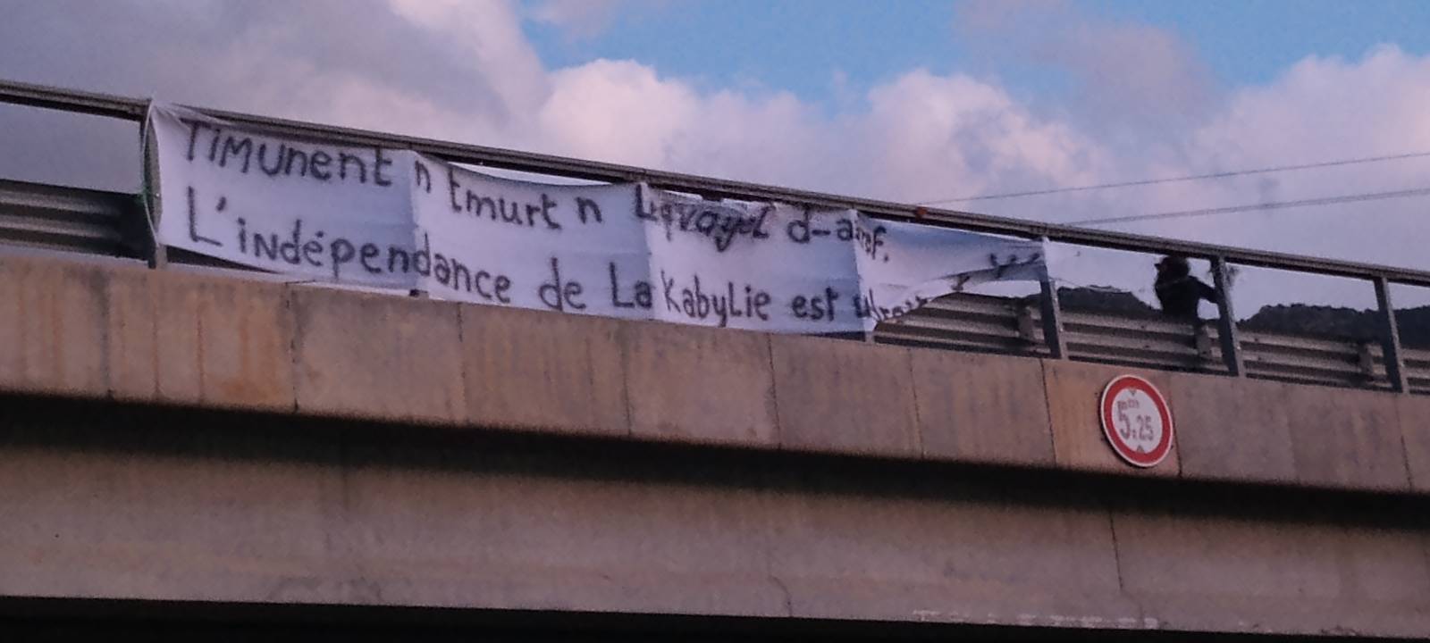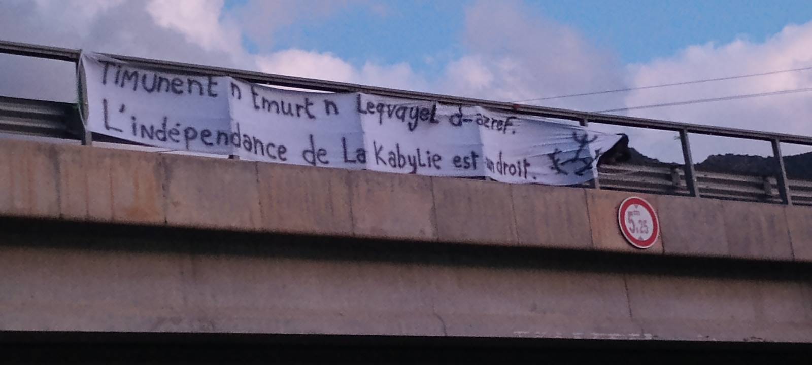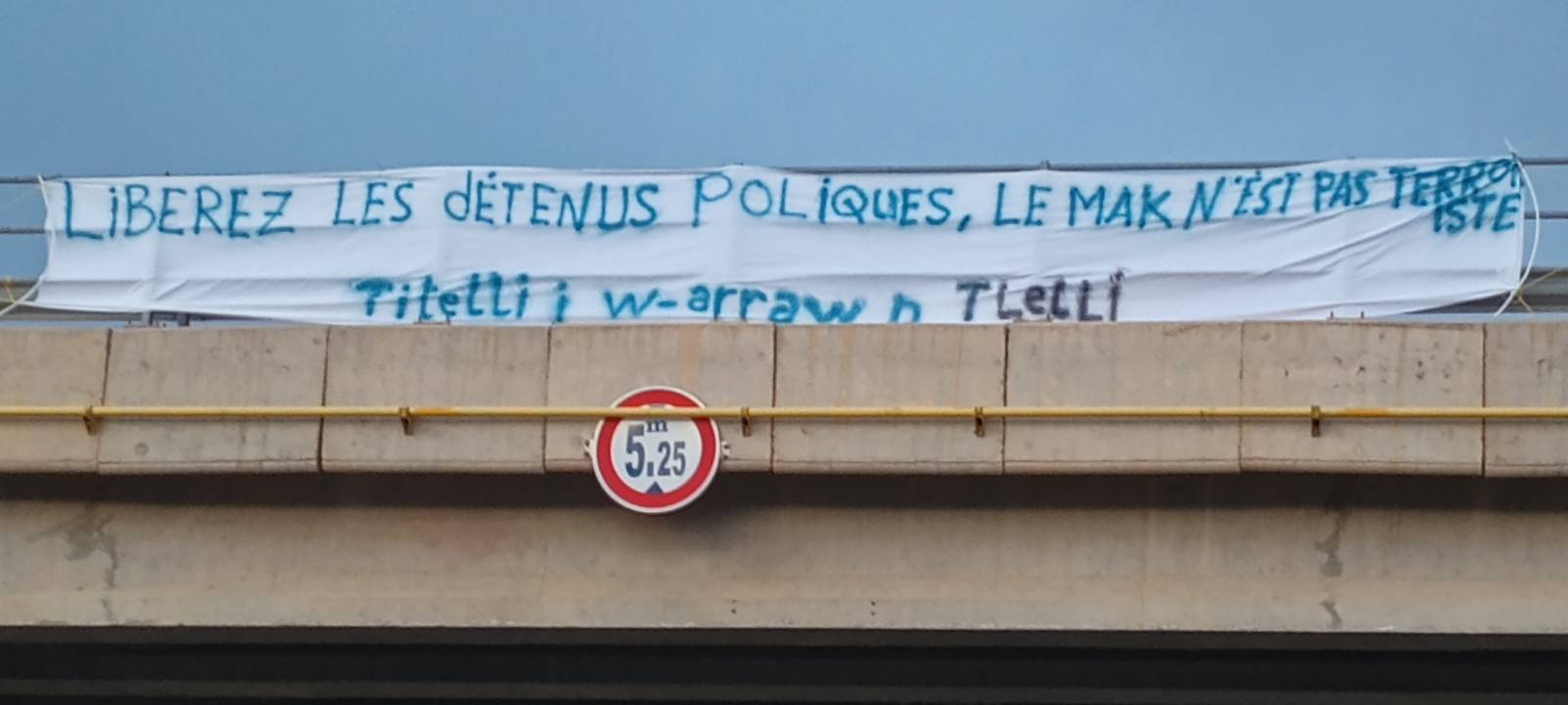 Vgayet, Kabylie (Siwel), 30 Mars 2025 – Il y a quelques jours, des militants kabyles ont mené une action symbolique en Kabylie, suspendant des banderoles sur deux ponts de l’autoroute Vgayet-Tuviret : l’une sur la bretelle menant vers Aqvu, l’autre sur celle menant vers Allaɣen.