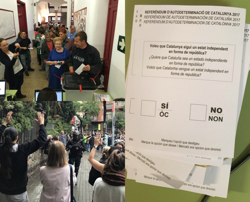 10h50 : L’exécutif catalan dispose d’un « recensement universel ». Le porte-parole du gouvernement catalan, Jordi Turull, a expliqué lors d’une conférence de presse, que l’exécutif disposait d’un « recensement universel » qui permettait aux électeurs de voter dans n’importe quel bureau de vote de la région, et non pas seulement dans celui où il sont inscrits. L’objectif est de maximiser la participation, alors que la police espagnole a déjà fermé ou encerclé plusieurs bureaux de vote. Une autre ruse catalane pour contrer l’interdiction espagnole.