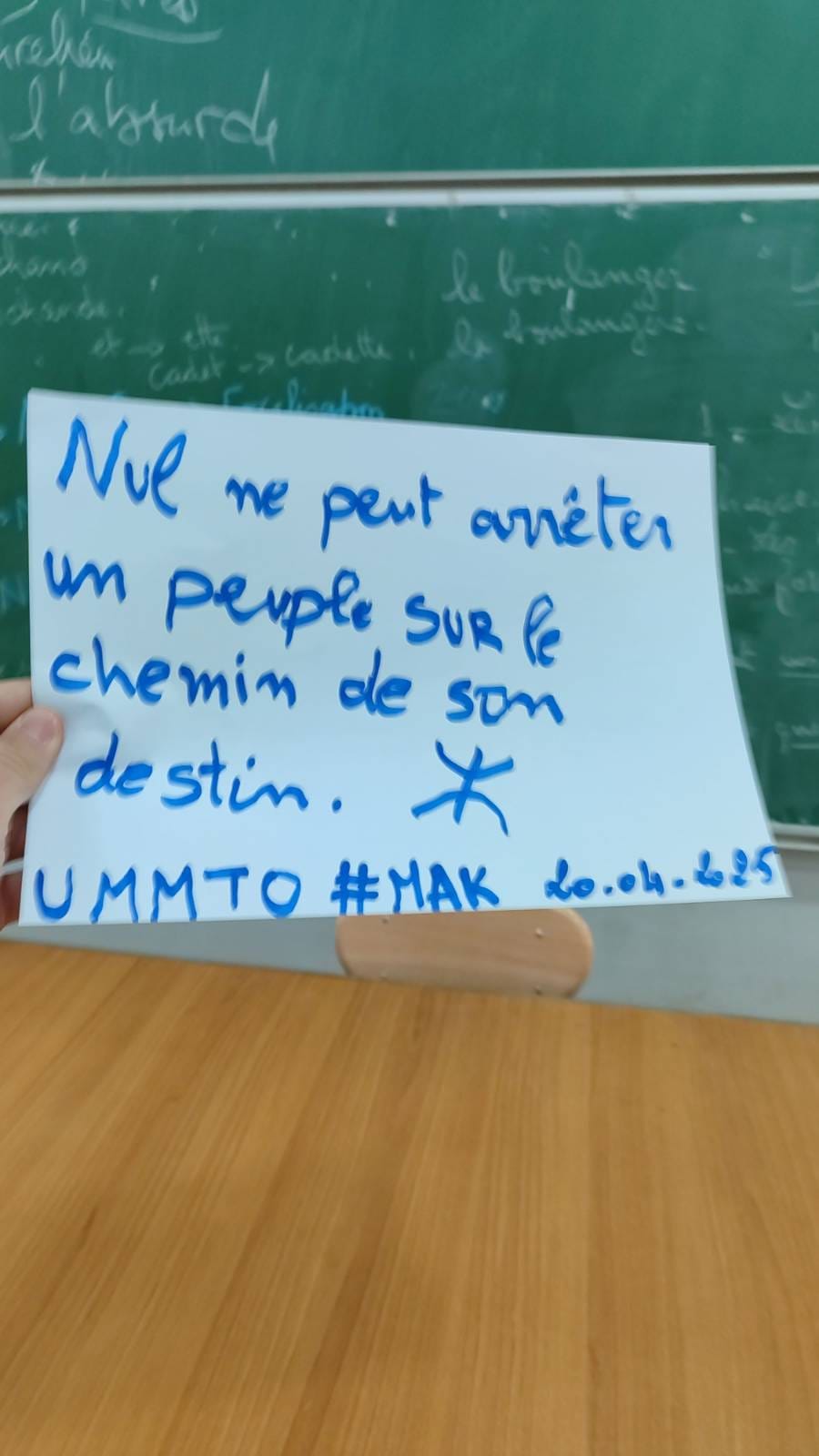 Université Tizi Wezzu, Kabylie (Siwel) – Dans les couloirs de l’université Mouloud Mammeri, des messages ont été laissés dans plusieurs salles de classe, amphithéâtres et sur les murs de l’établissement : appels à l’indépendance de la Kabylie, drapeaux kabyles, noms de prisonniers politiques, poèmes engagés.